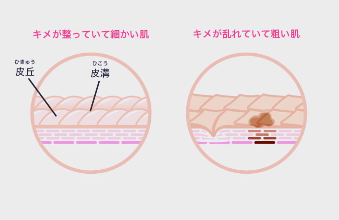 よくお肌のキメが細かいといいますが、お肌のキメとは皮膚表面を交差している細かい溝(皮溝:ヒコウ)とそれに囲まれているふっくらと盛り上がっている(皮丘:ヒキュウ)の凹凸の状態です。